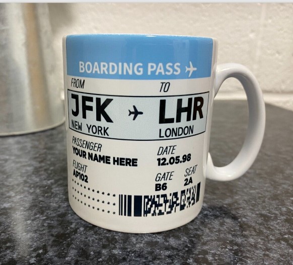 Take your coffee on a first-class trip with our unique Personalized Boarding Pass Mug! Perfect for jet-setters and travel enthusiasts, this stylish blue mug is designed to resemble a real boarding pass, adding a fun and personal touch to your daily routine.