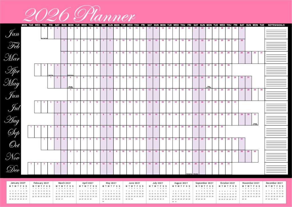 A3 – 1.6 metres Year Planner Wall Calendar Various Colours/Materials